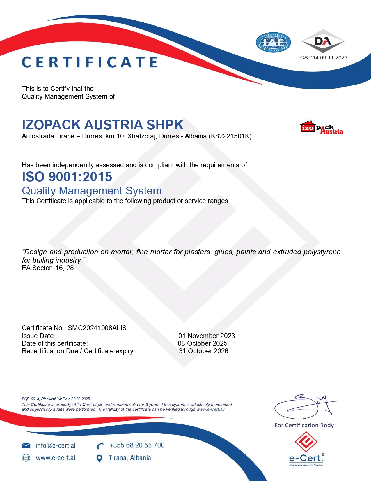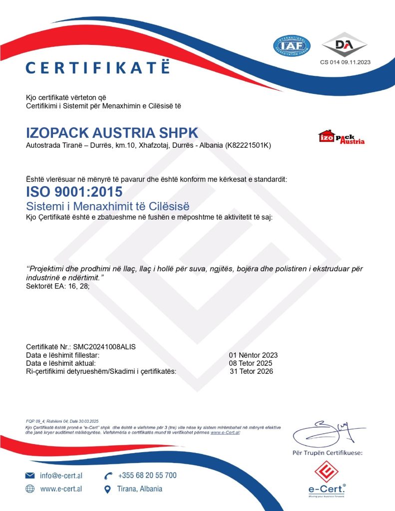 Kompania “IZOPACK AUSTRIA” lider ne prodhimin e polisterolit ne Shqiperi ne bashkepunim me kompanine gjermane “WEBER” ofron një gamë të gjerë produktesh për realizimin e izolimeve termike dhe hidroizolimeve te nderteses tuaj me garanci 20 vjecare.