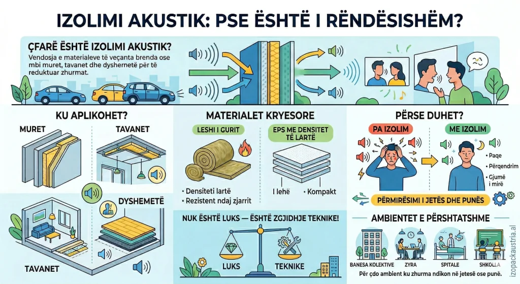 TL;DR: Izolimi akustik është vendosja e materialeve të veçanta (si leshi i gurit ose EPS me densitet të lartë) brenda ose mbi muret, tavanet dhe dyshemetë e ndërtesës, për të reduktuar zhurmat që depërtojnë nga jashtë ose kalojnë mes dhomave. Nuk është luks — është zgjidhje teknike për banesa kolektive, zyra dhe çdo ambient ku zhurma ndikon në jetesë ose punë.